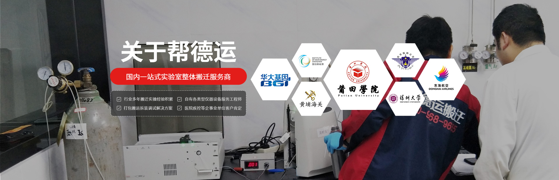 深圳市幫德運(yùn)搬遷有限公司,簡(jiǎn)稱“幫德運(yùn)搬遷”,成立于2016年,由深圳大學(xué)碩士畢業(yè)生創(chuàng)立,總公司位于深圳市龍崗區(qū)。經(jīng)過(guò)發(fā)展,幫德運(yùn)搬遷形成了深圳總公司,上海、西安、武漢、黃石等分公司或子公司為地區(qū)服務(wù)點(diǎn)的一站式全國(guó)性實(shí)驗(yàn)室整體搬遷服務(wù)商。